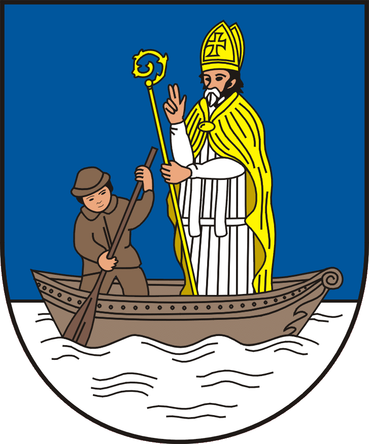 Znak města Husinec: Na modrém štítě pluje po stříbrné vodě směrem doprava hnědý člun. Na levé straně stojí ve člunu hnědě oděný převozník s veslem v rukou a s kloboukem na hlavě. Při pravé straně stojí v člunu doleva obrácený sv. Mikuláš, oblečený ve stříbrném spodním rouše a zlatém pluviálu a se zlatou mitrou na hlavě. V levé ruce drží zlatou berlu, zdviženou pravou rukou tiší vlny.